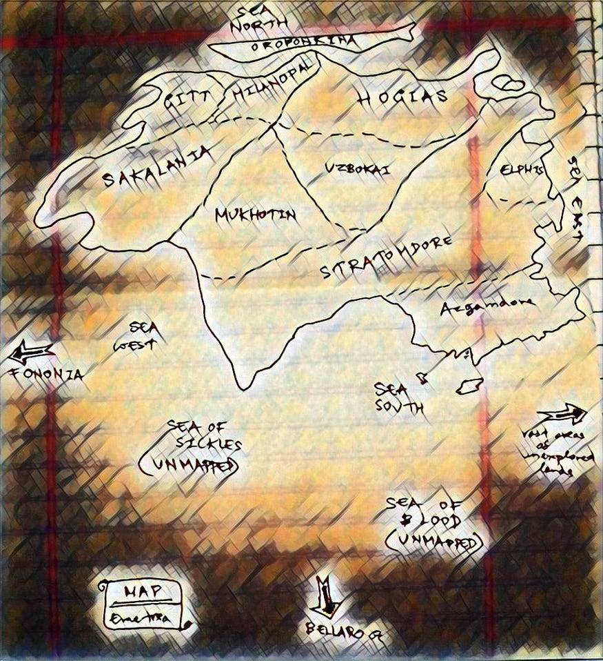 Emetria has a mixed range of climates ranging from temperate grasslands and peaceful monsoons, to biting cold in its northernmost kingdoms. The whole continent is divided up into kingdoms under rulers respective to each region, e.g. Azgamdore, Stratomdore, Uzbokai, Milanopal, etc. Most of the common races dwell and live in Emetria, including humans, orcs, goblins, trolls and elves.